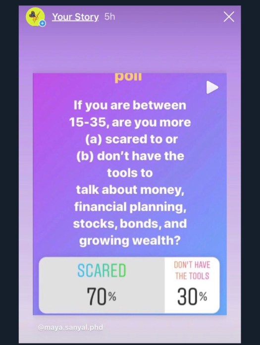 I did an informal IG poll on financial literacy comfort level, & out of 74 respondents (students in various colleges & early careers in the East Coast U.S. between 18-29 years old), 70% said they are scared to talk about money and 30% said they don’t have the tools (image below). This is a social justice & equity problem as well as an economic and business success problem.